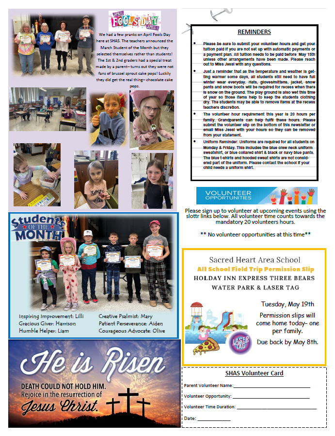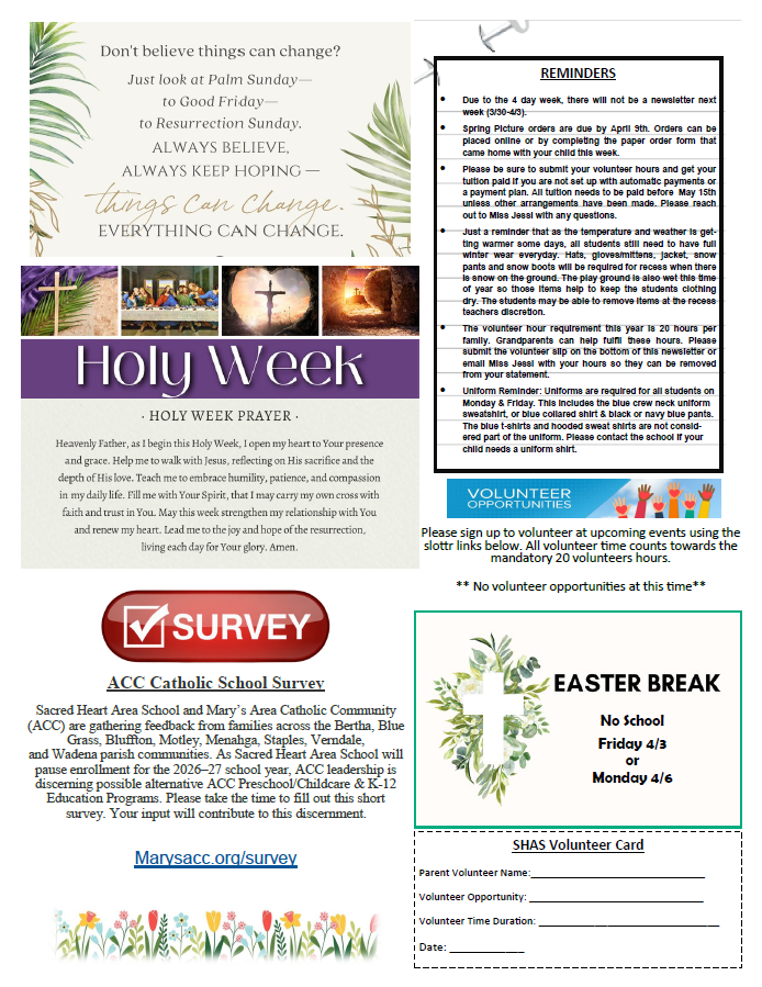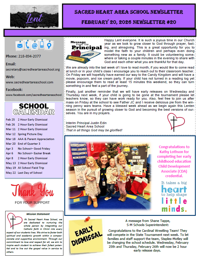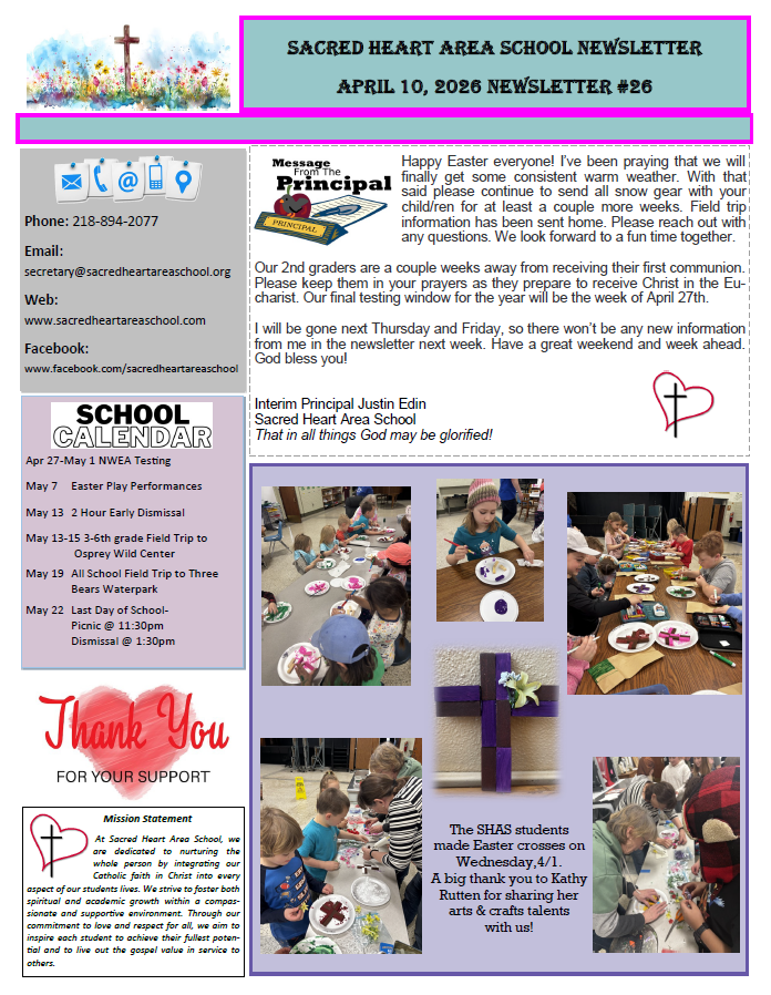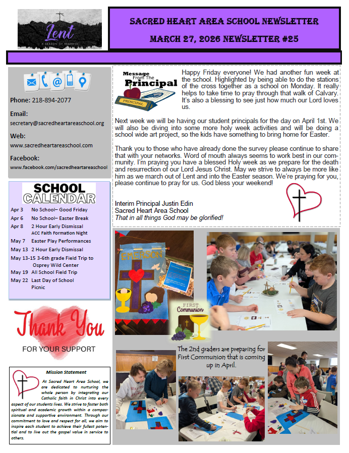 By living out these principles, Sacred Heart Area School seeks to prepare our students not only for academic success but for a life of faith-filled service and leadership in the world.